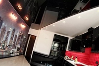 Кроме того, черный глянец сам по себе роскошен. В этом случае даже скромные осветительные приборы будут смотреться выигрышно и стильно.При выборе данного стилистического решения вам необходимо лишь определиться, видите ли вы больше минусов или плюсов в монтаже такого потолка. Если, на ваш взгляд, положительных моментов больше, не сомневайтесь и смело меняйте интерьер.