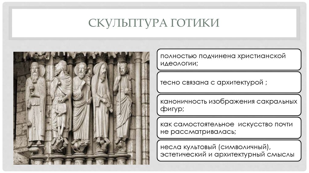Параллельно с архитектурой, готика подчиняла себе и другие сферы: скульптуру, без которой не обходилось убранство ни одного храма, живопись (знаковым явлением стал красочный и изящный витраж), жилые интерьеры – замки и дворцы вельмож.