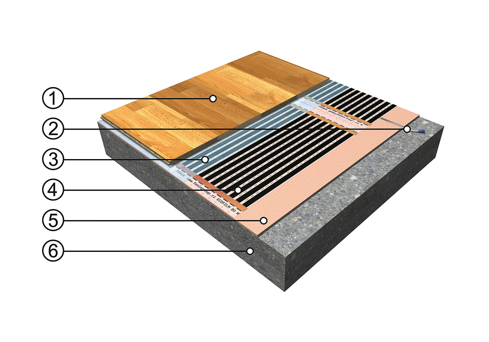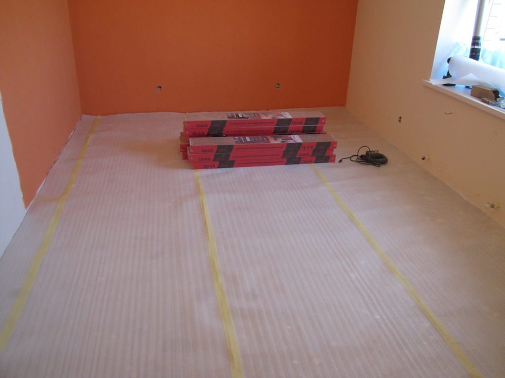 Порядок работ при устройстве обогрева зависит от конкретного оборудования. Жидкостный или электрический пол обычно укладывают в стяжку. Инфракрасный пленочный пол кладут на подложку под ламинат. Чтобы улучшить отражающие свойства нагревательных элементов в качестве подложки обычно берут материал с фольгированным покрытием.