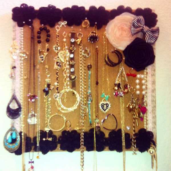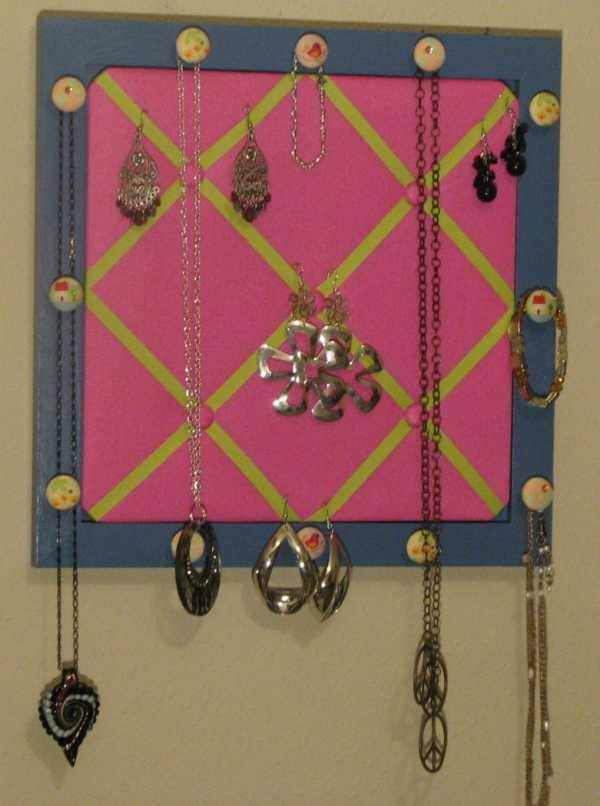 — На такой доске можно хранить и свою коллекцию украшений, так же прикалывая булавками, или цепляя, например, серьги за перетяжку. А можно сразу вкрутить крючки, или красивые маленькие, мебельные ручки, или просто вбить маленькие гвоздики и хранить бижутерию и разные штучки