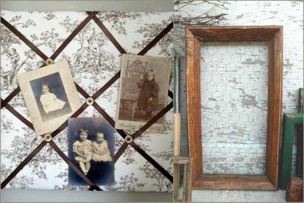 — Я уже выкладывала так называемые французские доски. Это доска, обтянутая тканью с поролоном, например. Или синтепоном, ватином и т.п. На такой доске можно размещать фотографии, открытки, прикалывая иголочками. Или перетянуть её тесьмой и размещать фотки не прикалывая, а закладывая за перетяжку.