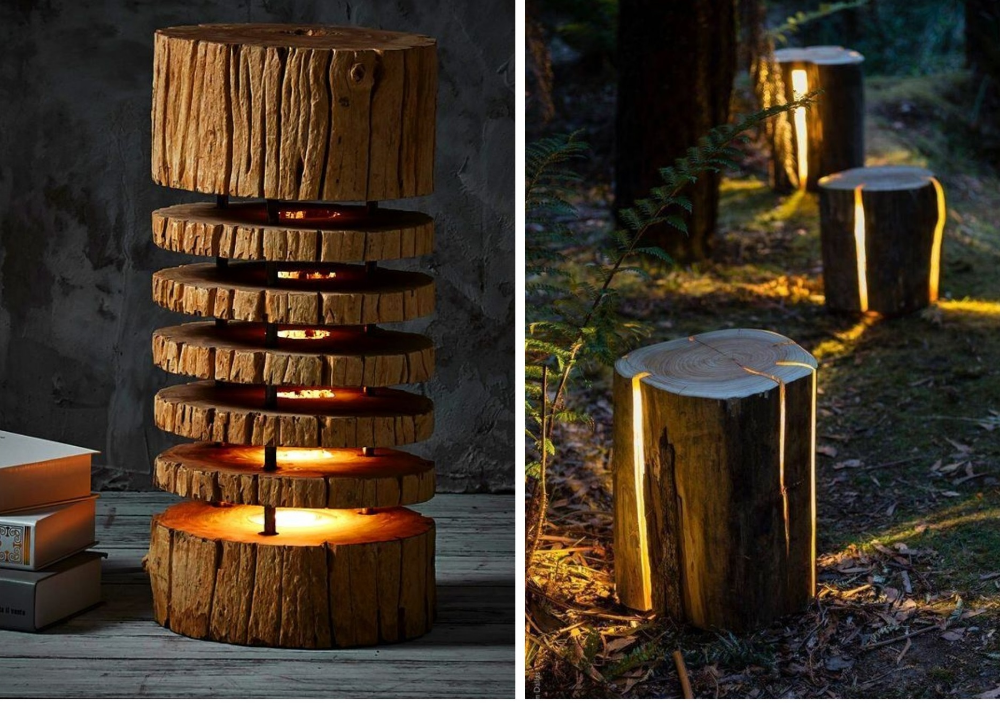 Светильники из деревянных спилов? А почему бы и нет! Это тоже возможно. Распилите на неширокие кругляки бревно и сделайте в центре отверстие. Соедините все элементы с помощью бруса, как нанизывают детали в детской пирамидке. На него также закрепите светодиодную ленту – абсолютно уникальный предмет интерьера готов.