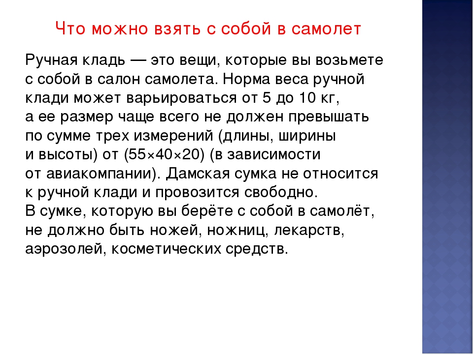 Π§ΡΠΎ ΠΌΠΎΠΆΠ½ΠΎ ΠΏΡΠΎΠ²ΠΎΠ·ΠΈΡΡ Π² ΡΡΡΠ½ΠΎΠΉ ΠΊΠ»Π°Π΄ΠΈ ΠΈ Π±Π°Π³Π°ΠΆΠ΅. Π§ΡΠΎ Π·Π°ΠΏΡΠ΅ΡΠ΅Π½ΠΎ Π²ΠΎΠ·ΠΈΡΡ Π² ΡΠ°ΠΌΠΎΠ»Π΅ΡΠ΅