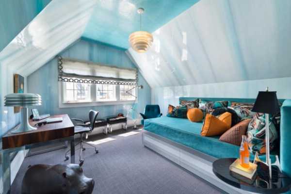Дизайн интерьера в голубых тонах предусматривает использование разных оттенков, не только абсолютно голубого, это бирюзовый, васильковый, небесный, циан. Такие тона делают комнату прохладной, раздвигают визуально стены и поэтому подходят для низких и небольших помещений.