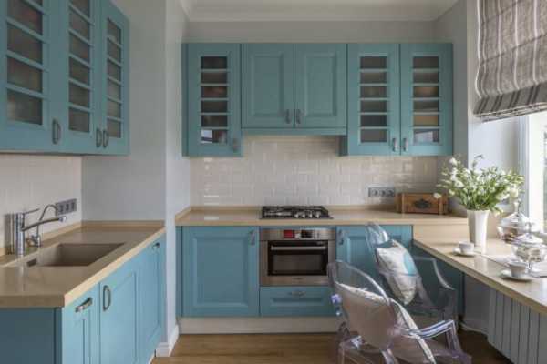 На фото приглушенный бирюзовый цвет фасада кухонной мебели в сочетании с голубыми стенами создают нежный стиль, который близок к деревенскому и стилю прованс.