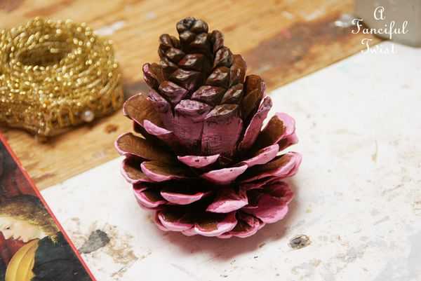 Во время покраски мне пришла в голову идея, что необязательно оставлять верхушки шишек заостренными. При помощи кусачек можно удалить несколько лепестков соснового конуса и открыть стебель, как показано ниже.