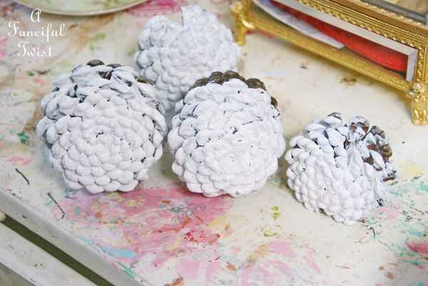Чтобы отбелить сосновые или еловые шишки их предварительно очищают, а затем тщательно просушивают. Далее на ночь погружают в любое средство для прочистки труб, наполовину разведённое водой. Снова промывают и снова сушат. Как только плоды раскроются, их опускают в неразбавленную «Белизну» и через 7 – 8 часов тщательно ополаскивают, после чего держат в тепле до полного удаления влаги и восстановления формы.