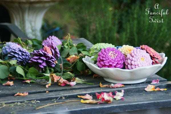 С одной стороны плоды сосны удивительно похожи на розы, с другой – на садовый цветок, под названием цинния. Достаточно повернуть хотя бы один экземпляр стержнем к себе и убедиться, что это действительно так. Остаётся только добавить рукодельным «цинниям» красочности и букет из них будет выглядеть совсем как настоящий.
