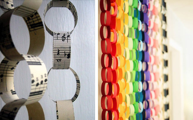 Можно делать цепочку разноцветной либо однотонной. Готовым изделием можно украшать стены либо елку. Если сделать несколько таких цепочек и прикрепить их на верхнюю перекладину дверного проема, получатся отличные межкомнатные шторки. Для того чтобы цепь была ровной, стоит использовать шаблон. Его можно изготовить из плотного картона.