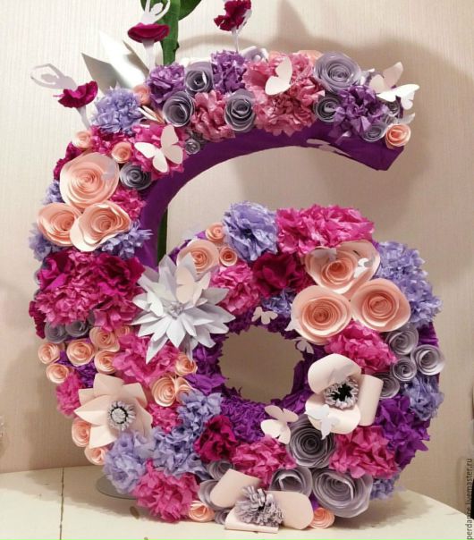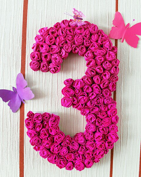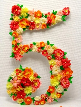 Изготовить красивую цифру на день рождения ребенка можно, применив соответствующую технику. Цветочки из бумаги, закрепленные на картонном каркасе, создадут желаемую композицию.