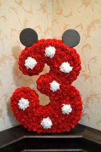 Стоит сказать о том, какое примерно количество цветочков необходимо для одной цифры. На двойку метровой высоту мы затратили около 230 цветков, сделанных первым способом. Считайте, что на цифру высотой пол метра вам потребуется около 120 цветков.