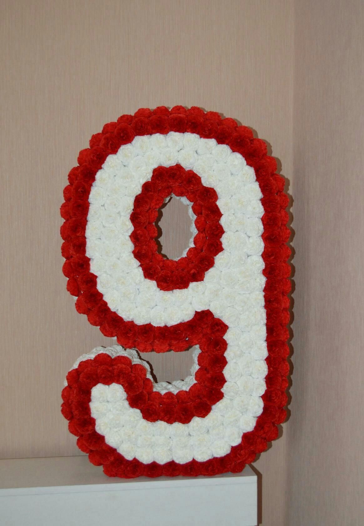 Свойства гофрированной бумаги позволяют делать из нее объемные красивые цветы. Если вы умеете составлять розы или гвоздики из гофрированных лепестков, можно сделать оформление плоской или объемной цифры из них. Эффект будет потрясающим, однако времени на каждый цветочек потребуется немало.
