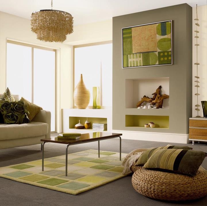 При подборе цвета стоит ориентироваться на уровень освещенности и особенности пространства. Если у вас есть камин или предусмотрена ниша для книг, то выступы можно покрасить в оливковый. Здесь же можно разместить диван, но его обивка в таком случае должна быть более нейтральной.