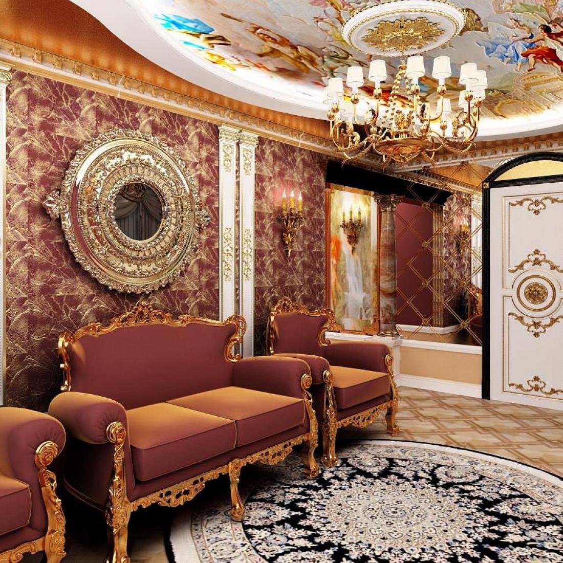 - отделка золотым стилем потолков и стен.