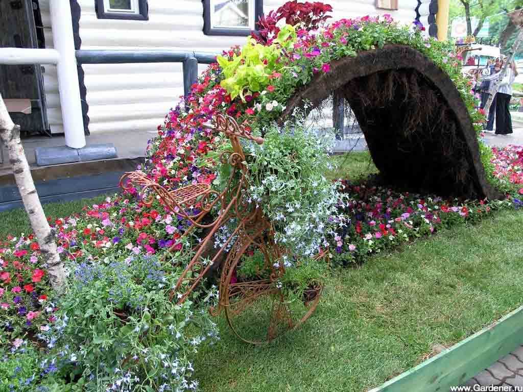 В сети можно найти много фото и видео с клумбами и цветниками из любых подручных материалов. Тут нет предела фантазии. Использовать можно и старые колеса, и тачки, и садовый инвентарь. В качестве ограждения подойдет и старая ванна, вопрос только в том, что так можно захламить цветник, переборщить с наполнением его объемными формами.