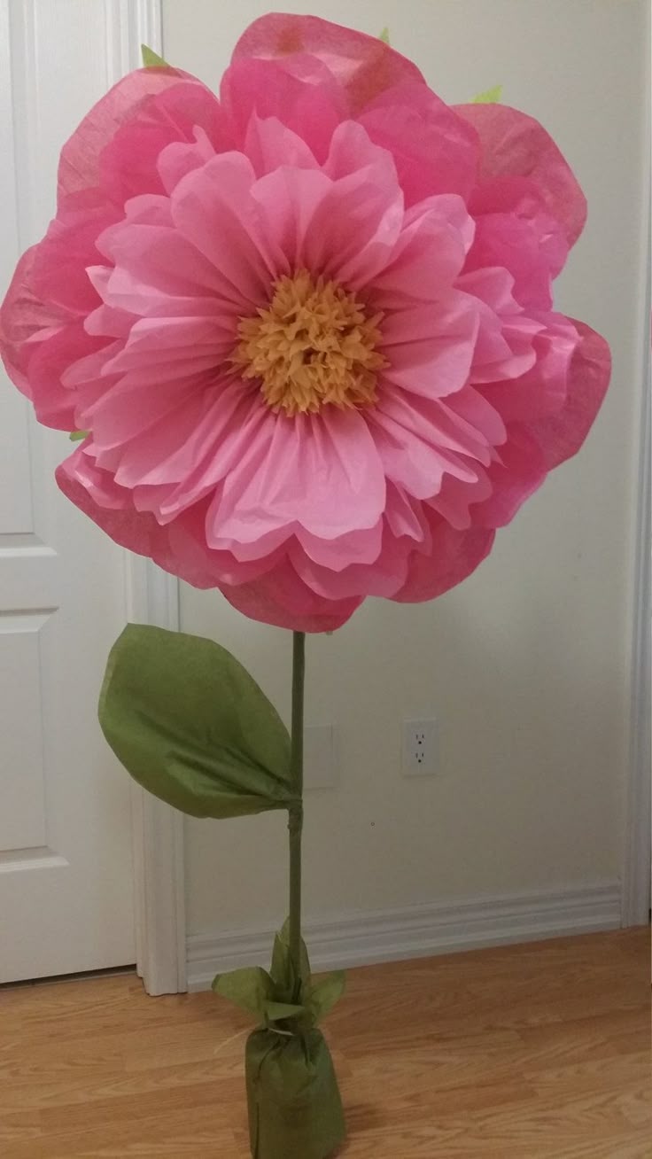 Большие бумажные цветы на ноге очень эффектный прием . Сама по себе имитация настоящего цветка в большом размере смотрится крайне интересно. Такие ростовые цветы стали достаточно популярными, по этой причине мы решили показать как можно сделать такой декор своими руками. В данной статье мы покажем как сделать бутон цветка большого размера — до 80-100 см в диаметре, а также немного опишем как и из чего можно сделать ногу для такого цветка, если вам нужны именно стоящие цветы.