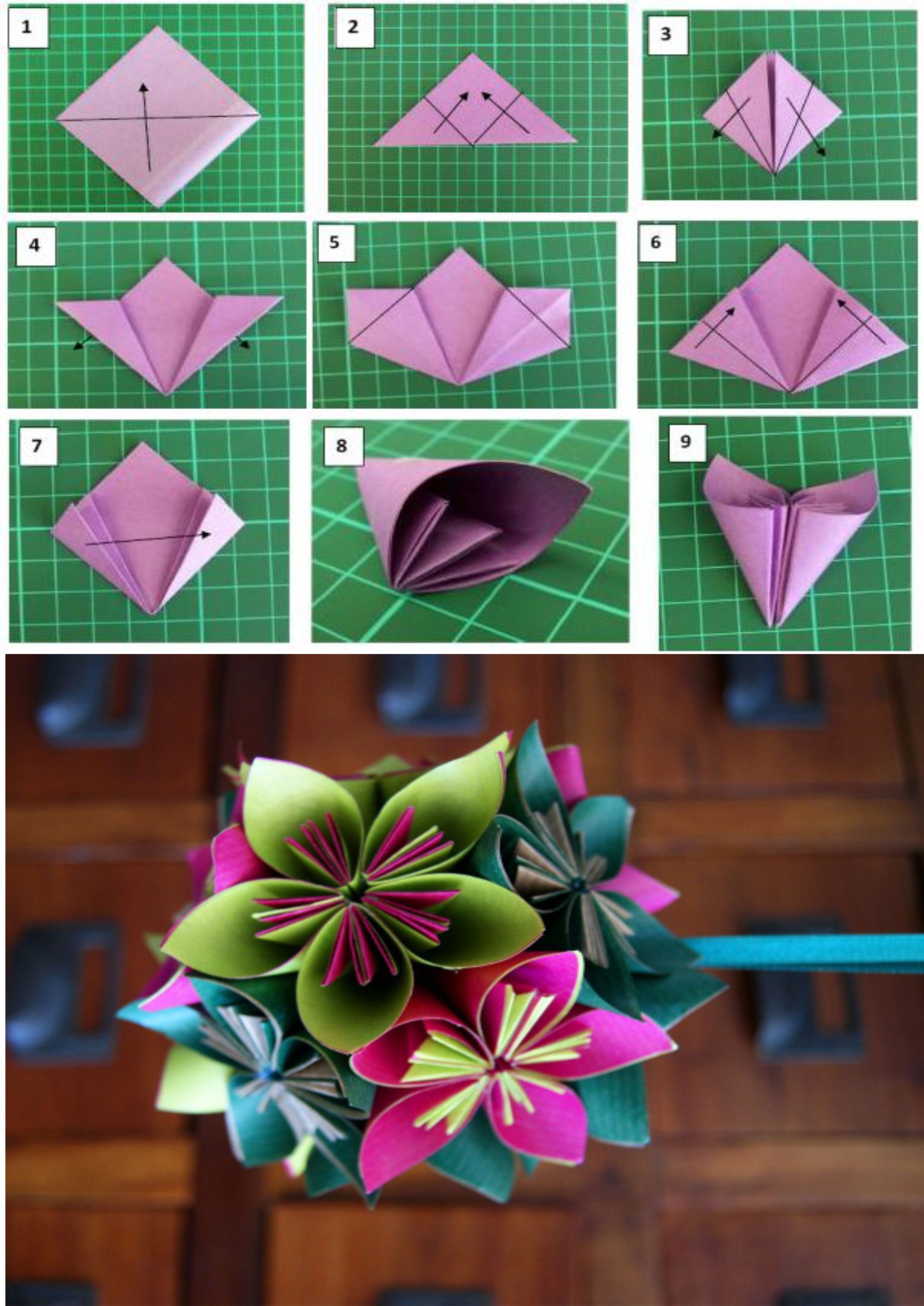 Приготовьте много квадратов размером 5х5 см. Сложите их так, как показано на схеме. Разверните квадратики, а затем заверните края с помощью пинцета. Мелко нарежьте бумагу того же цвета. Залейте немного клея на «дно» цветка, а затем добавьте несколько тычинок.