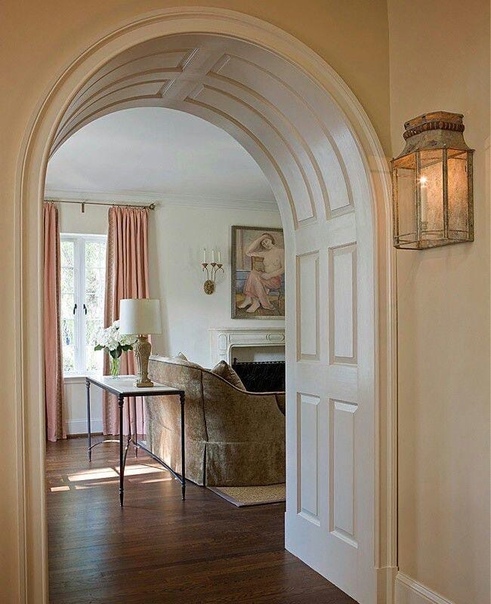 Проем в стиле «модерн» по конструкции представляют половину эллипса, расположенного поперек с хорошо заметным переходом прямой линии к закругленному участку. Такие конструкции смотрятся стильно и изысканно. Они отлично подойдут к интерьеру светлых помещений в прованском или морском стиле, будут идеально смотреться на входе в гостиную или вместительную кухню.