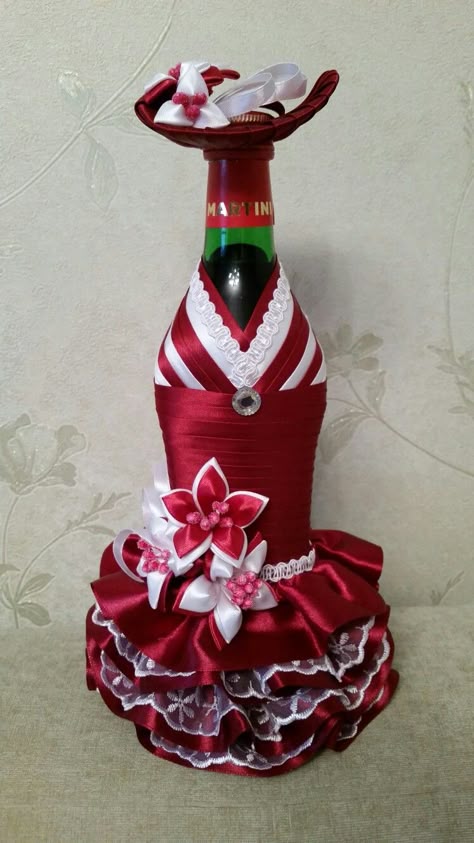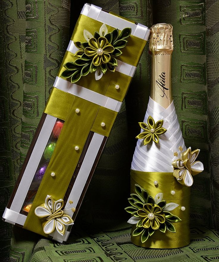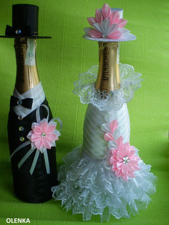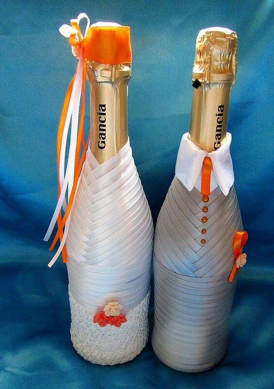 Бутылки шампанского, украшенные атласными лентами как «Он» и «Она», становятся неотъемлемым атрибутом свадебного торжества. До недавнего времени этим занимались специалисты, а сегодня украшение бутылок лентами может освоить каждый, у кого есть элементарные навыки рукоделия. Такой декор выполняется в разной технике, начиная от простого оплетения атласными и парчовыми полосками до восхитительного исполнения в трудоемкой технике канзаши или чтобы дополнить декупаж.