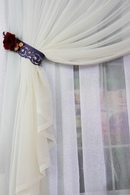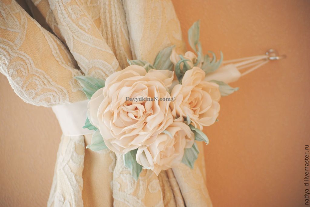 Нежная атласная заколка канзаши смотрится необычно на простых сливочных шторах и обеспечивает надежную поддержку.