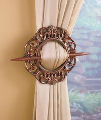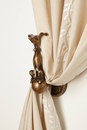 К вделанным в стену металлическим креплениям прикрепляются подвязки. Но они могут служить и самостоятельным украшением. В таком случае шторы просто закидываются за основу держателя. Головка приспособления может быть невыразительной и незаметной, но чаще всего ее украшают цветочные мотивы, спирали и другие украшения из металла, дерева или пластика.