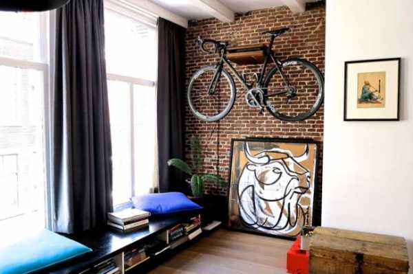 davХарактерными чертами лофт стиля является использование предметов быта в качестве декора. Как вам велосипед, подвешенный на стену и используемый как декоративная единица.