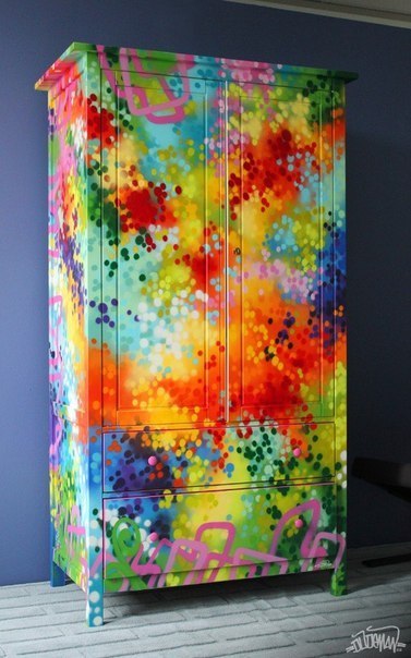 Если есть желание иметь расписанную яркими красками мебель, но нет таланта художника, то на помощь придут трафареты, с использованием которых делаются рисунки. Их можно купить в строительных магазинах или подготовить своими руками из картона. Также потребуется краска в баллончиках. Способ преображения прост и творчески интересен.