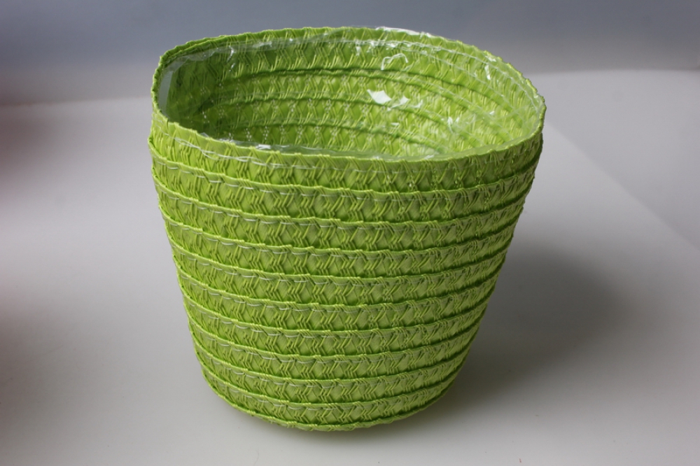 Если это пластмассовое ведерко цилиндрической формы, то отрез ляжет ровно без проблем. А вот на классическом горшке цилиндрической формы придется приклеивать кусочки ткани внахлест друг на друга, а излишки в верхней части по окончании работы обрезать.