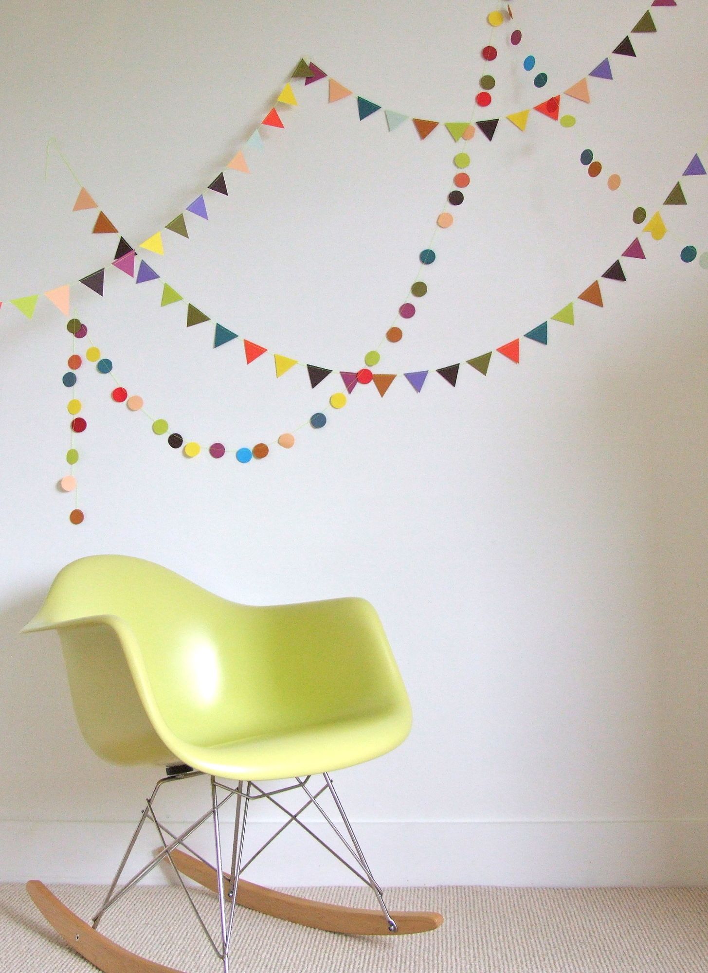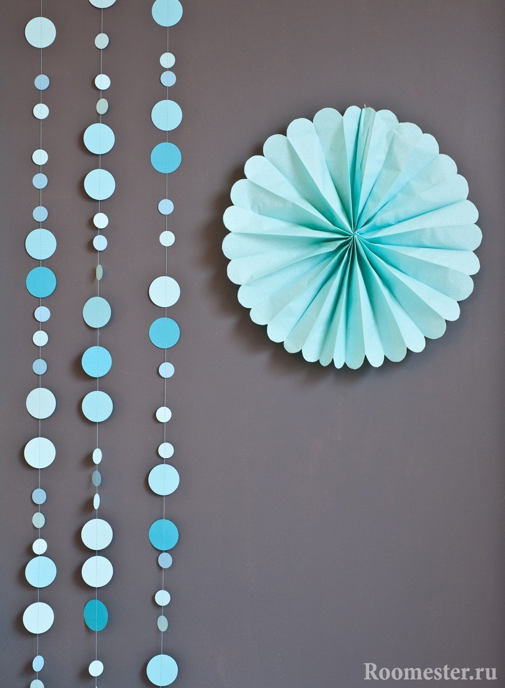 - Кружочки. Гирлянда из одинаковых бумажных кружочков тоже не требует больших сил в создании, а комната с нею моментально меняется.