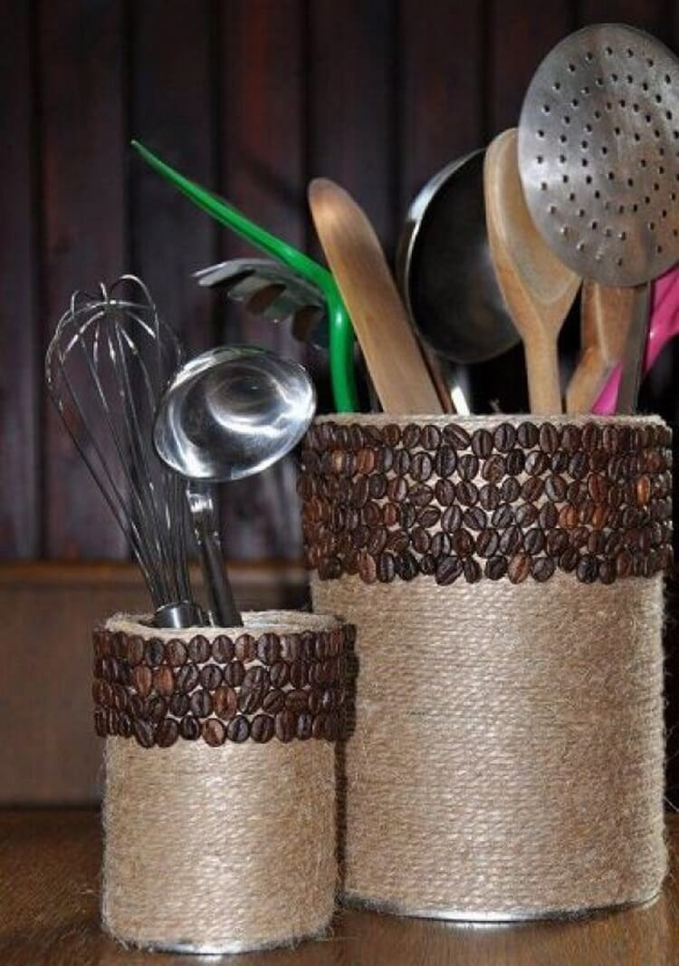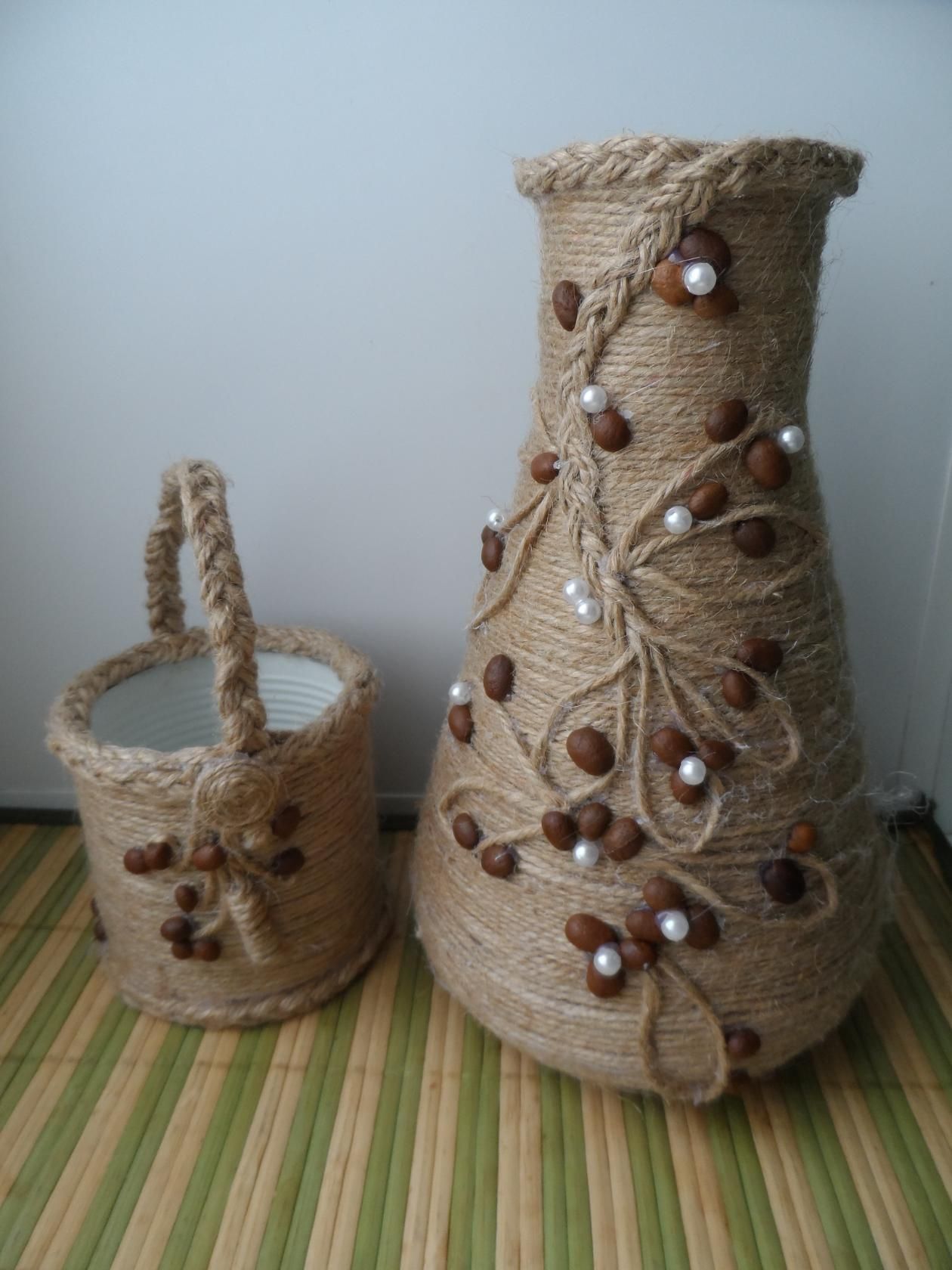Если использовать не только джут, но и какие-то предметы для основы, то получится долговечный оригинальный аксессуар. Очень легко сделать различные фигурки из джута на базе стеклянных бутылок или ваз. Очень популярны кошки. Можно делать парные композиции. Хороши для декорирования кофейные зерна. Несколько идей таких фигурок вам на выбор.