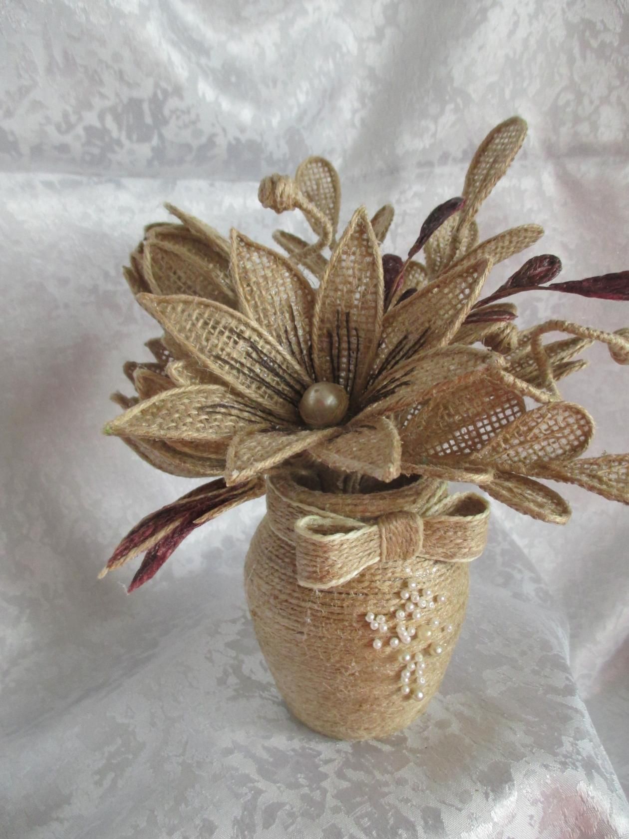 Ниже приведены несколько схем и примеров, как еще можно оформить подставку из джута.