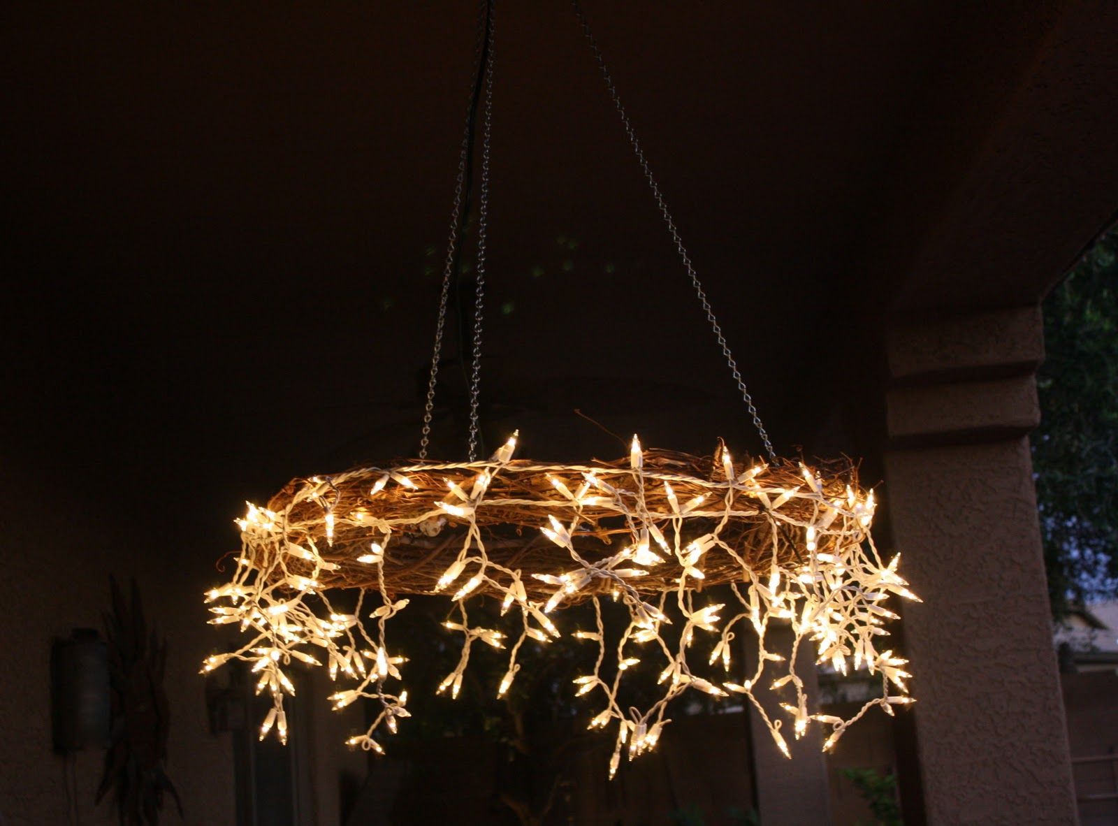 Варианты решений для самостоятельной сборки безграничны. Давайте почерпнем немного вдохновения от сказочной уличной люстры ниже. Вы можете использовать свои рождественские огни в течение всего года как часть подвесной уличной люстры.Просто оберните их каким-нибудь элементом, как закругленное зеленое решение на картинке ниже, и вы получите волшебный вид, который вы хотели.