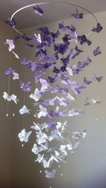 “Парящие бабочки”. Для создания этой невесомой люстры, колышущейся от каждого дуновения ветерка, вам понадобятся пяльцы или круглый абажур с двумя кругами, тонкая декоративная цепь, аэрозоль с серебряной или другого цвета краской, прозрачная пластмасса (плотная бумага, калька), ножницы.