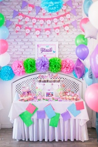 Без этого яркого атрибута не обходится ни одно детское торжество. Воздушные шарики вешаются по одному или группами, из них можно собирать интересные композиции в виде фигур, цифр, имени девочки, поздравительных надписей, арок, колонн. Если они достаточно плотные, можно разбросать по полу, получится целое разноцветное море.