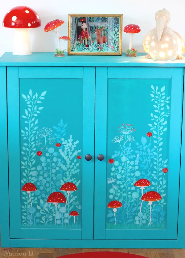Благодаря простому набору предметов, можно самостоятельно создать красивый декор, не имея при этом способностей художника. Сложные цветочные композиции, геометрические фигуры быстро перенесутся на поверхность мебели и помогут ей вписаться в современный дизайн дома. Элементы декора наносят как на просто подготовленную поверхность, так и на предварительно окрашенный фон. Линии на шкафах создаются с помощью клейкой ленты.