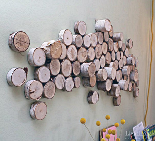Обшивка стены обрезками досок и кругляка создает неординарный и очень стильный вид. Можно использовать элементы различной длины и сечения, формы бывают прямоугольные и кругляка. Их разноуровневое размещение открывает практически безграничный горизонт для фантазии. Рельефная поверхность может частично использоваться функционально – сильно выступающие доски сыграют роль полок.