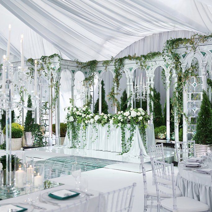 В белом шатре, будто с чистого листа, можно воспроизвести любую стилистику, использовать самые смелые цветовые решения. Но беспроигрышной классикой является оформление с обильным использованием зелени — это придаст вашему торжеству и стиль, и приятную свежесть.