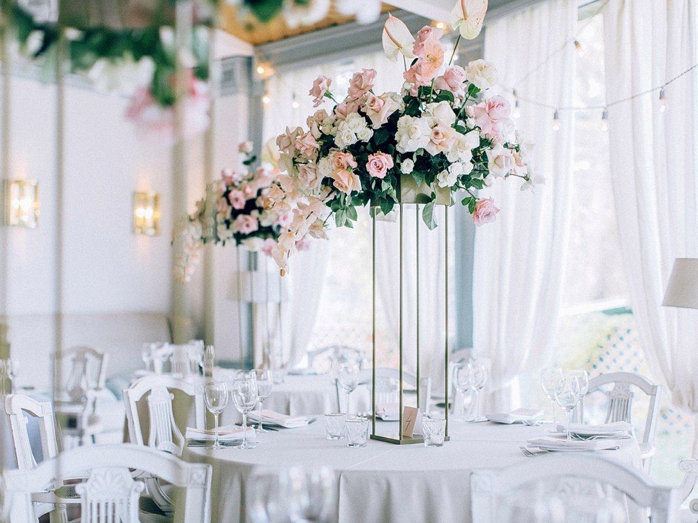 - Классическая европейская рассадка предполагает установку одной объемной композиции в высокой вазе или на подставке в центре каждого столика.