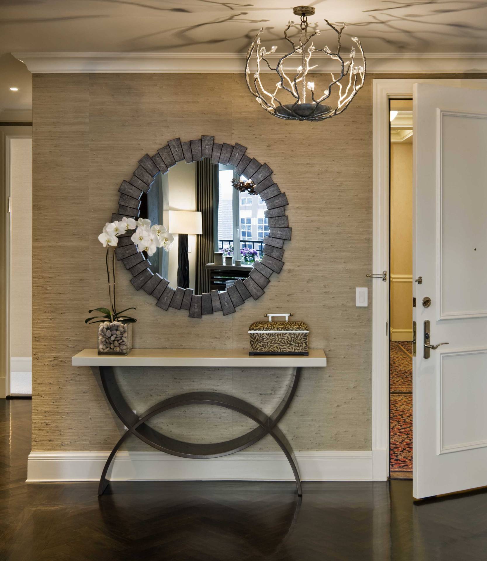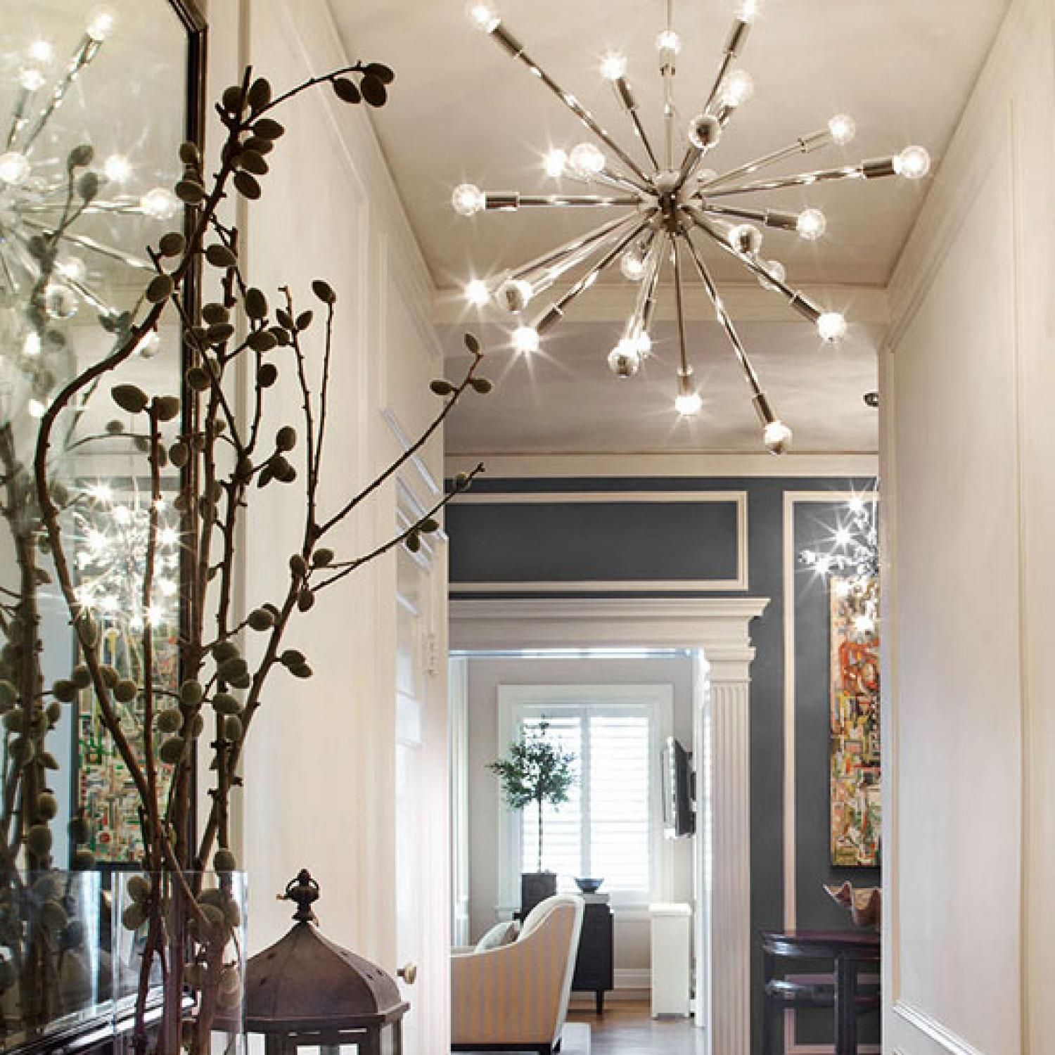 Студия Трейси ЛиннЭтот великолепный холл, освещенный латунными фонарями, украшен черно-белыми фотографиями, светло-коричневыми деревянными полами и желто-серой дорожкой.