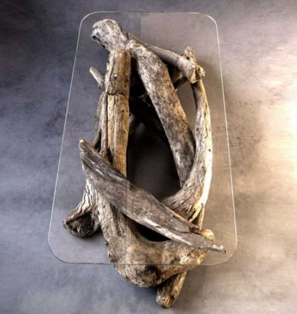 Что только уже не создавали дизайнеры с помощью «подножных» кусков дерева: тумбочки, светильники, столы, табуреты и вешалки, подсвечники, полки. Умельцы-самоучки создают удивительные конструкции, которые по красоте и функциональности ничем не уступают дорогостоящим дизайнерским моделям. Например, как этот стеклянный стол на ножках из нескольких стволов. Для этого понадобятся старые высохшие ветки, палки или пни интересных форм, которые можно найти на улице. Или же коряги, выловленные из реки или моря.