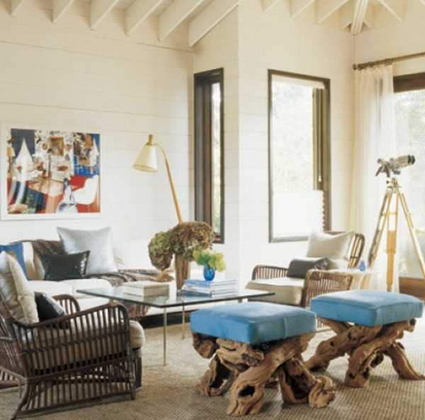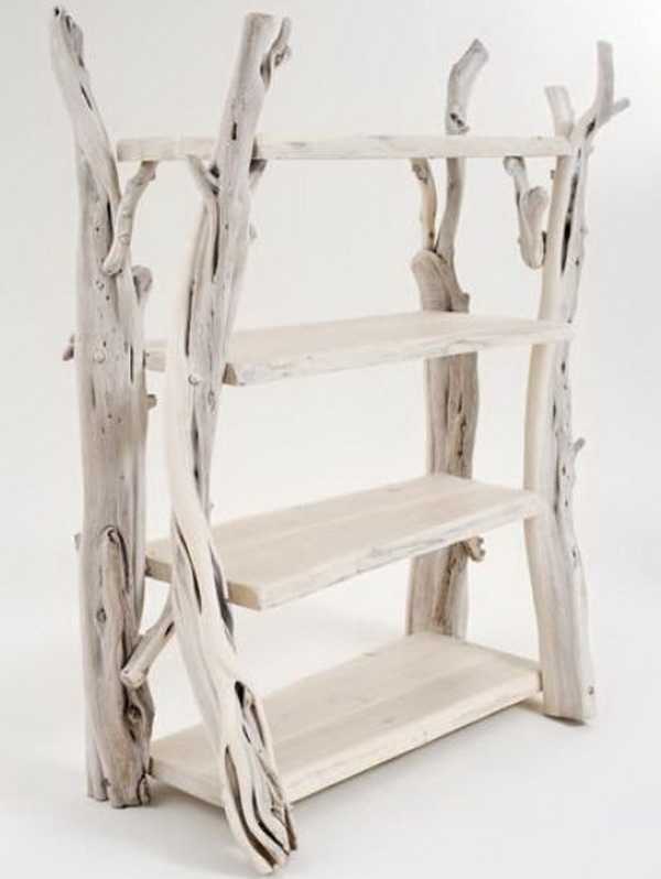 Весьма оригинальные и красивые столы и табуреты получаются при наличии красивых узловатых больших стволов и коряг. Можно сделать простой прикроватный столик, но гораздо красивее стол со стеклянной столешницей, сквозь которую хорошо видны изгибы и рисунок древесины. А если вам посчастливится обнаружить очень большую корягу, то можно из него сделать шезлонг. Более менее ровные стволы тоже не надо выбрасывать – из них можно сколотить очень полезные стеллажи.