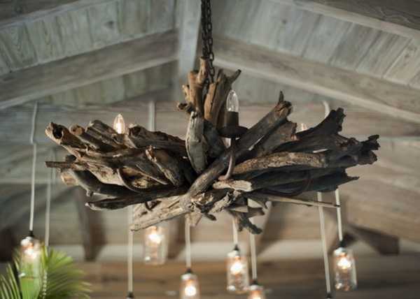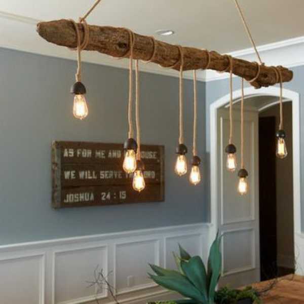 С помощью веток можно создать просто удивительные конструкции. Например, вот этот потолочный светильник из бревна, на который намотаны шнуры с лампочками.