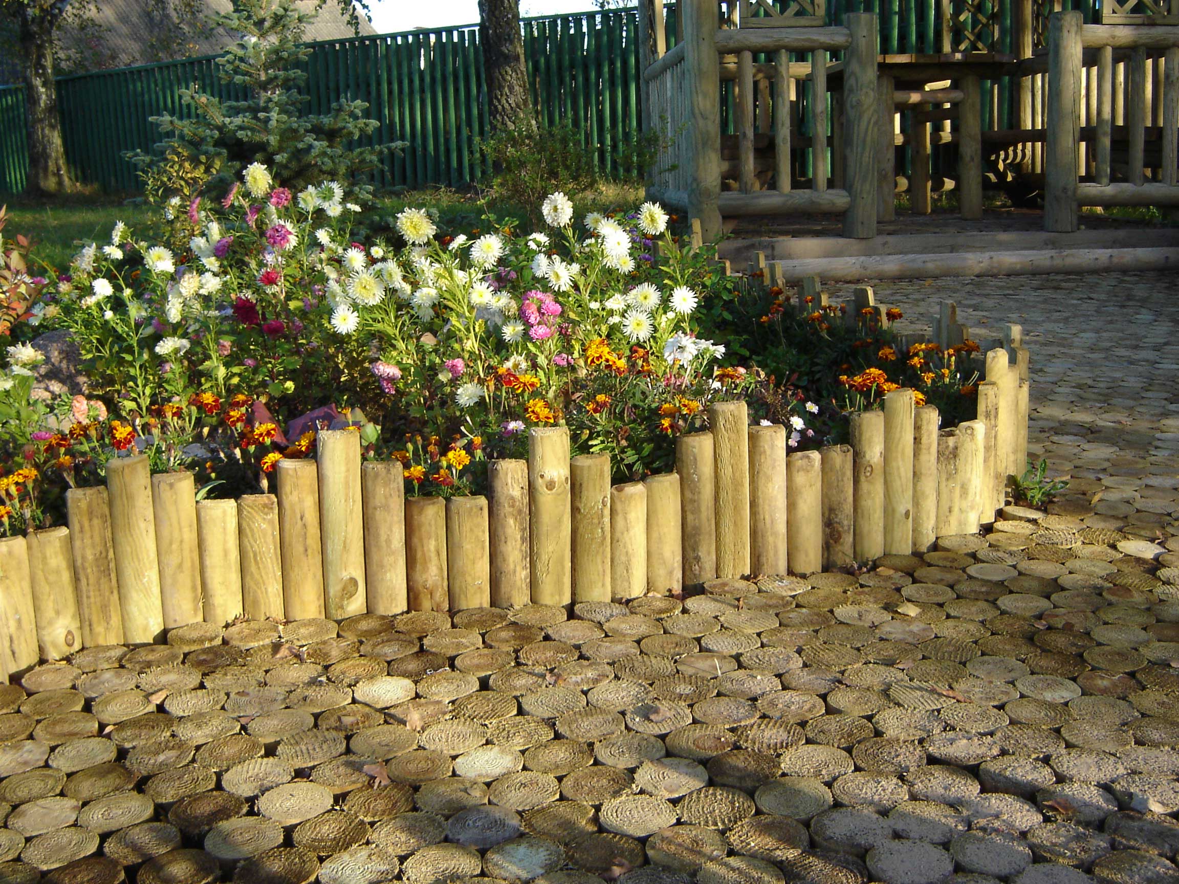 В этом ограждении использованы сразу два материала: камень и дерево. Сам заборчик сделан из поленьев, причём каждый имеет разную высоту. Внутри самого цветника между растениями выложены несколько камней.