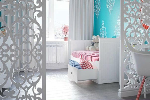 На фото детская комната с декоративной ажурной перегородкой, расположенной между кроватями.