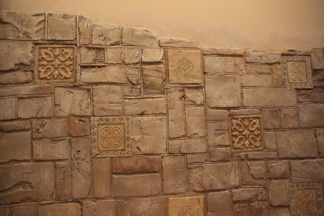 Данная технология позволяет без трудоёмкого изготовления форм выполнить своими руками имитацию любого вида кладки и материала. Будет ли это кирпич со строгой геометрией связки швов или имитация кладки из природного камня разного размера и формы с бессистемной конфигурацией стыков, зависит от фантазии исполнителя и общего интерьера помещения.