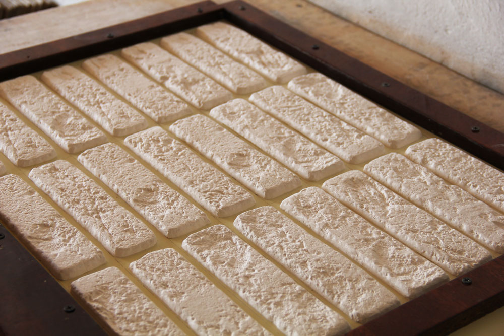 Гибкость резиновых стенок формы позволяет легко извлечь застывшие изделия начиная с крайних, поддевая их ножом снизу. Затем гипсовые полоски нарезаются на куски длиной 25 см, соответствующей длине кирпича, их торцы подрабатываются ножом, и плитка раскладывается в один слой для полной просушки.