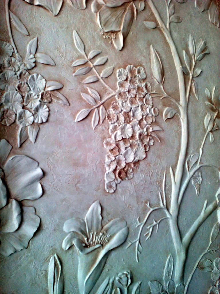 На участок стены шпатлевкой или теркой нанести шпатлевку толщиной, в зависимости от желаемой глубины рельефа. Затем создаем рисунок: