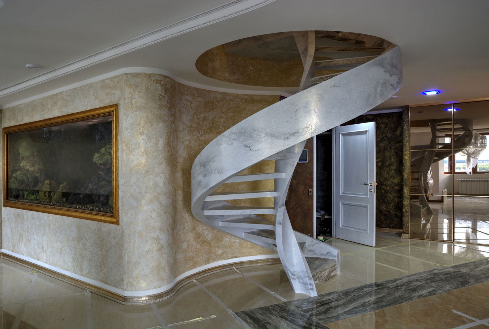 Популярная венецианка — это имитация тонкого мраморного или ониксового покрытия с просвечивающимися тонкими слоями. Штукатурка этого типа требует кропотливой, сложной работы, но в итоге получается идеально гладкая поверхность, покрываемая тонким слоем воска для придания естественной фактуры. Такой вариант отделки идеально подходит для просторных залов и помещений в классическом стиле.