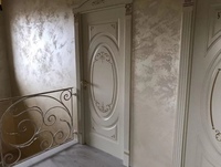 Для создания эффекта переливающегося покрытия используется штукатурка «мокрый шелк». После нанесения на поверхности формируются перламутровые мягкие переливы, имитирующие тончайшую, просвечивающую ткань.