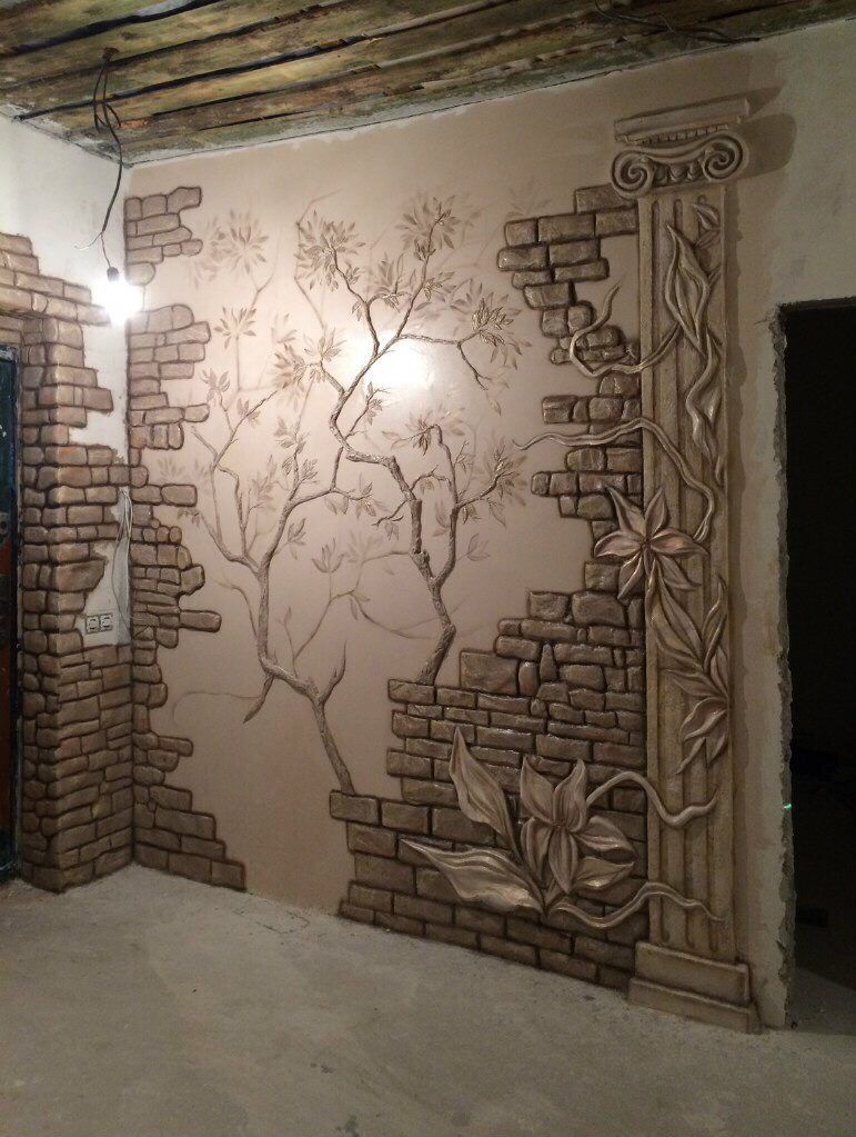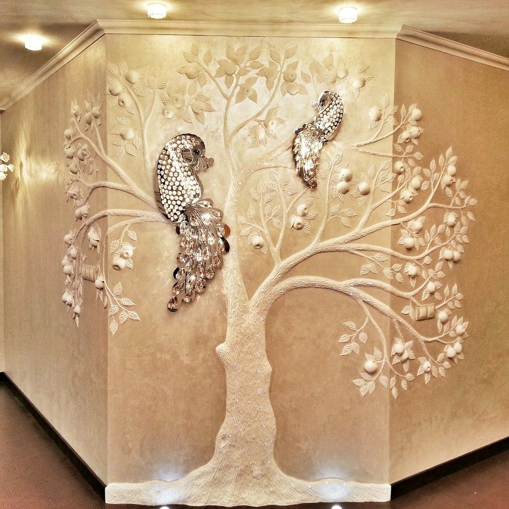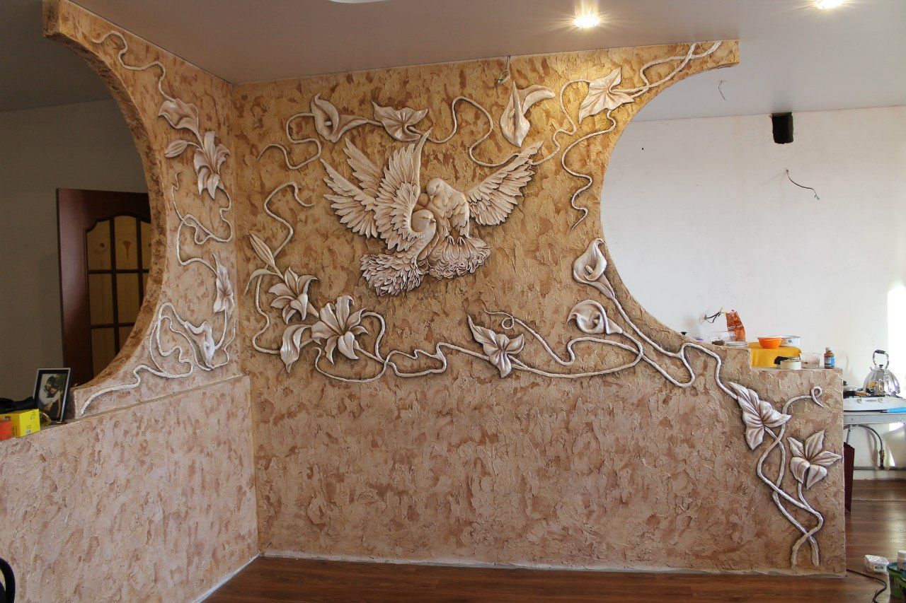 Объемный декорВоссоздание укрупненного декорирования требует опыта и вкуса – это трудная процедура. Предварительно всё пространство обрабатывается базовой основой, зарисовывают выполняемый узор, формируют массу послойной укладкой, шлифуют, раскрашивают и выполняют заключительные этапы. В итоге выходит искусная картина, которая может стать главным акцентом интерьере.